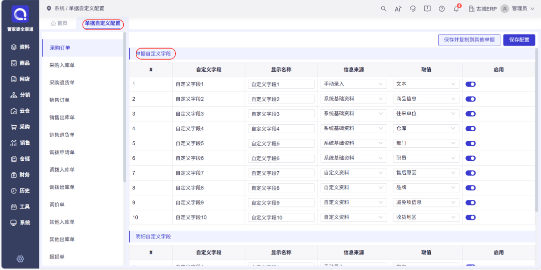 企业版进销存相关单据打印的表头表尾字段增加单据自定义字段打印