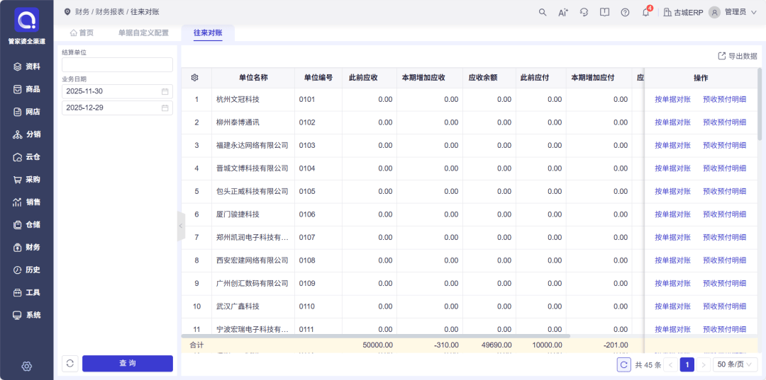 往来对账支持查询与某往来单位的所有钱流相关的往来情况。